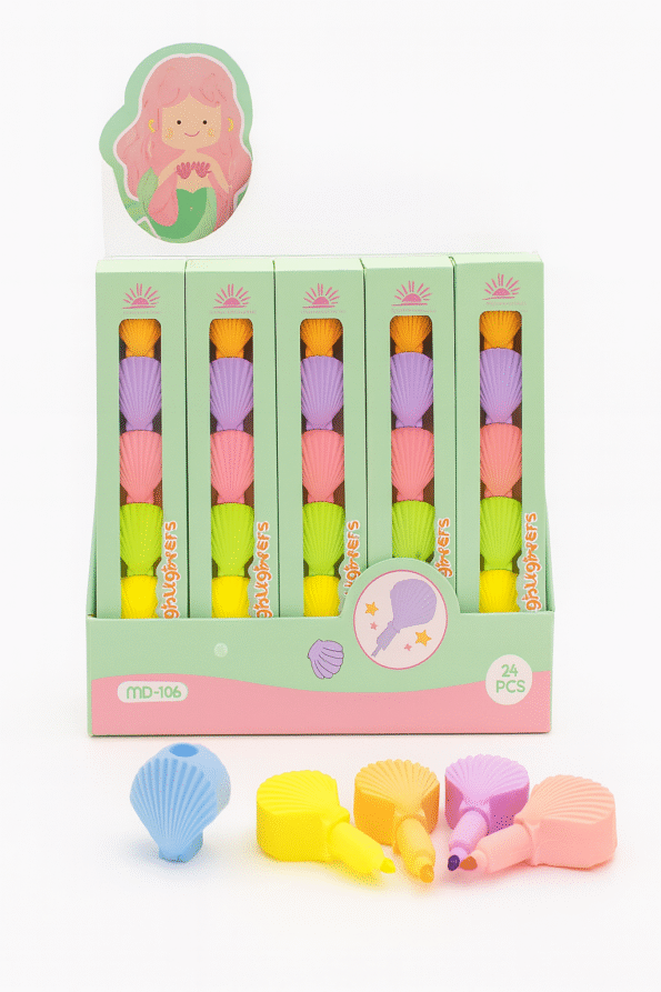 Eğlenceli tasarımı ve canlı renkleriyle dikkat çeken Clickety Clack deniz kabuğu fosforlu kalem seti, hem çocuklar hem de yetişkinler için mükemmel bir kırtasiye ürünüdür. İstiflenebilir (üst üste geçmeli) yapısı sayesinde düzenli saklama imkânı sunar ve masanızı daha şık hale getirir. Çocukların ilgisini çekecek sevimli tasarımıyla aynı zamanda harika bir hediye seçeneğidir.