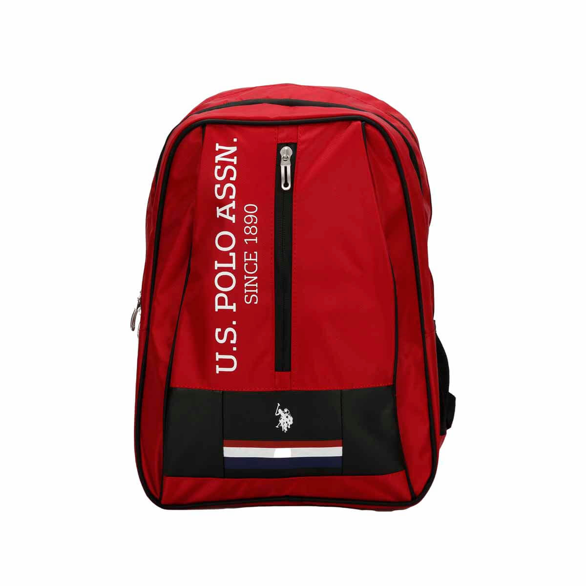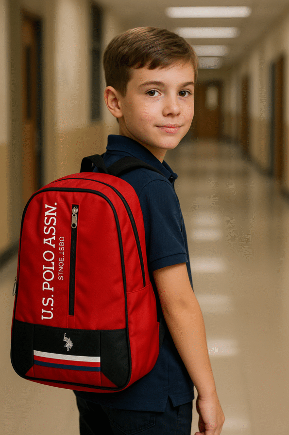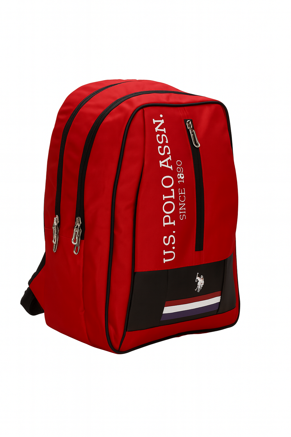 U.S. Polo Assn. kırmızı okul sırt çantası – su geçirmez kumaş, dayanıklı tasarım, 2 geniş bölme, ergonomik omuz askıları. Ortaokul, lise ve günlük kullanım için ideal şık çanta.